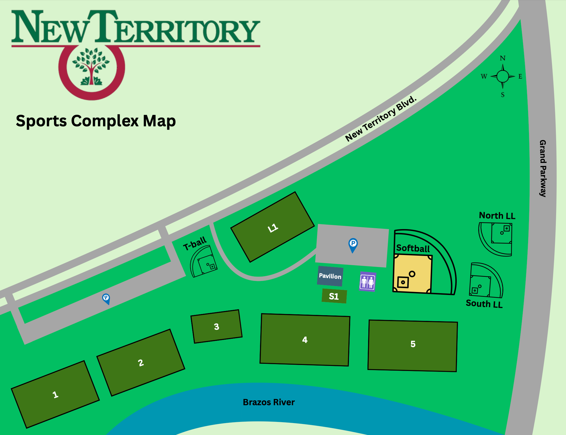 Located in the heart of Sugar Land, New Territory Sports Complex is a premier training and competition destination designed to support athletes at every level. The complex features two full-sized turf fields, three full-sized grass fields, and two 9v9 turf fields, providing versatile, high-quality space for practices, games, and large-scale events. Visitors enjoy the comfort of indoor restrooms, free paved parking, and convenient bleacher seating, creating an elevated and family-friendly game day experience. With easy access from across the greater Houston area and a layout built for both performance and organization, the complex offers an ideal environment for player development and competitive excellence.